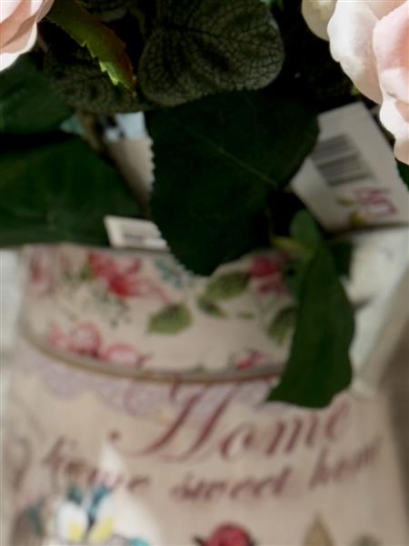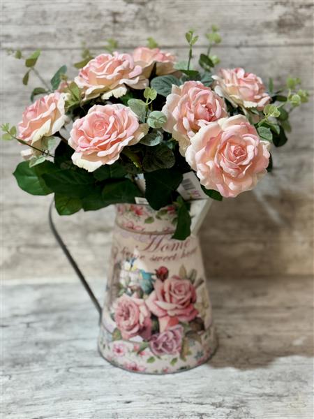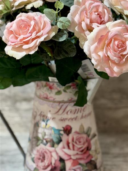 Bring a touch of timeless charm into your home with this stunning artificial rose display. Soft blush pink roses are beautifully arranged amongst delicate green foliage, all nestled in a vintage floral jug that reads “Home Sweet Home.”
