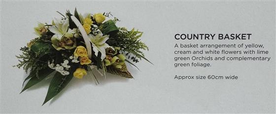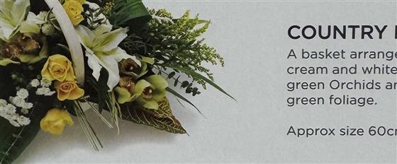 A beautiful basket arrangement of yellow, cream and white flowers, featuring striking lime green Orchids and complementary green foliage. A bright yet elegant arrangement, suitable for funerals, memorials or sympathy occasions.