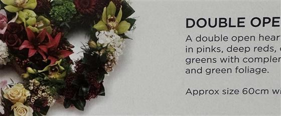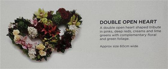 A beautiful double open heart shaped tribute in shades of pinks, deep reds, creams and lime greens, finished with complementary flowers and green foliage. A meaningful and loving tribute to honour and remember a loved one.