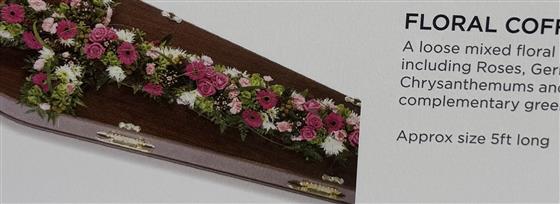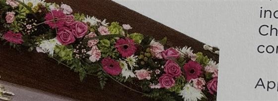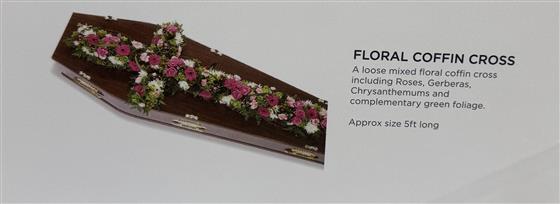 A loose mixed floral coffin cross including Roses, Gerberas and Chrysanthemums, finished with complementary green foliage. A traditional and elegant tribute suitable for a coffin or service arrangement, created with care and compassion.