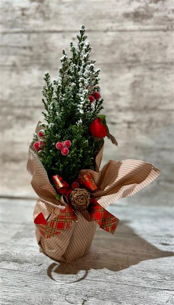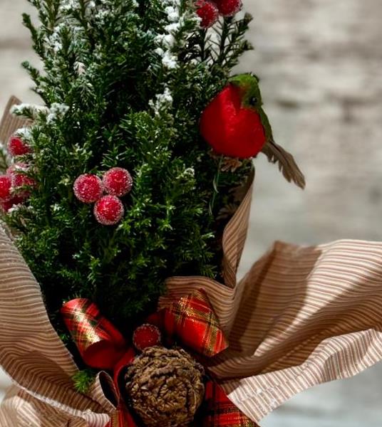 These adorable little snowy trees are dressed with festive berries, a cute robin, rustic ribbon and wrapped beautifully — the perfect gift, table decoration or doorstep treat to bring a bit of Christmas magic into any home.