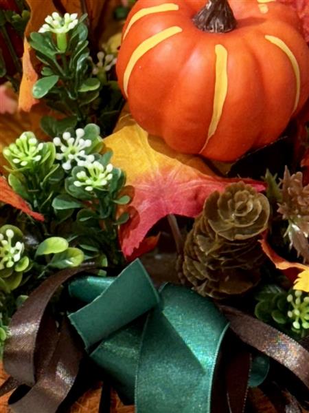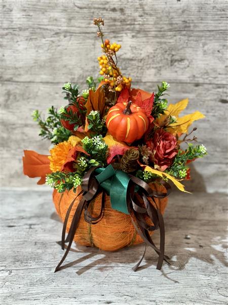 Bring the beauty of autumn indoors with this stunning seasonal display. Nestled inside a textured pumpkin base, this arrangement bursts with vibrant shades of burnt orange, golden yellow, rustic red, and woodland green. Adorned with lifelike berries, foliage, and a charming mini pumpkin, it’s finished with rich satin ribbons for that extra touch of harvest magic.
