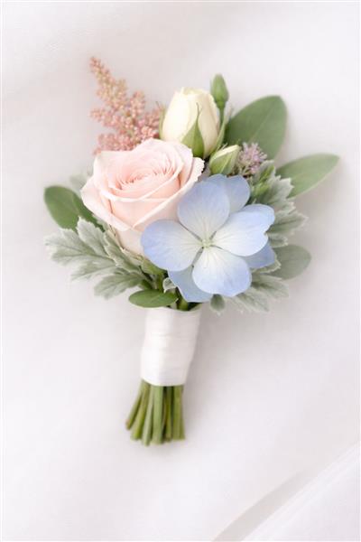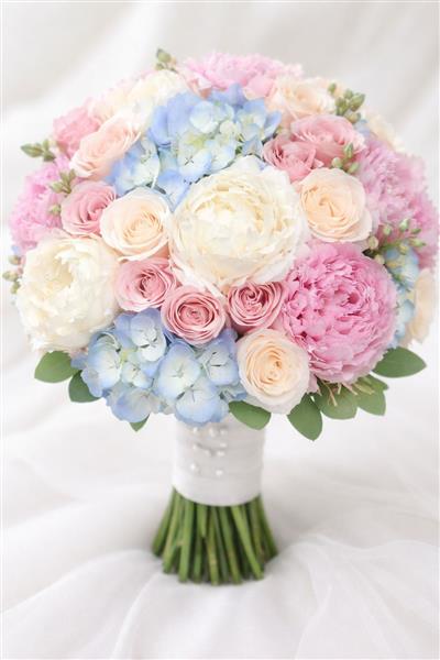 The stems are wrapped neatly in white ribbon, which is accented with pearl-like pins, giving it a polished, elegant finishing touch. The bouquet’s colour palette — cream, blush pink, peach, and powder blue—creates a soft, romantic, and timeless look, perfect for a wedding or formal occasion.